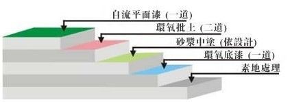 ⑥自流平面漆:用自流平型環(huán)氧面漆均勻鏝涂一道,完工后達到光亮潔凈,顏色均一,無空鼓;