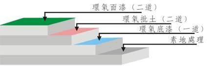 ③ 環(huán)氧底漆:采用滲透性及附著力特強(qiáng)環(huán)氧底漆滾涂一道,增強(qiáng)表面附著力;
